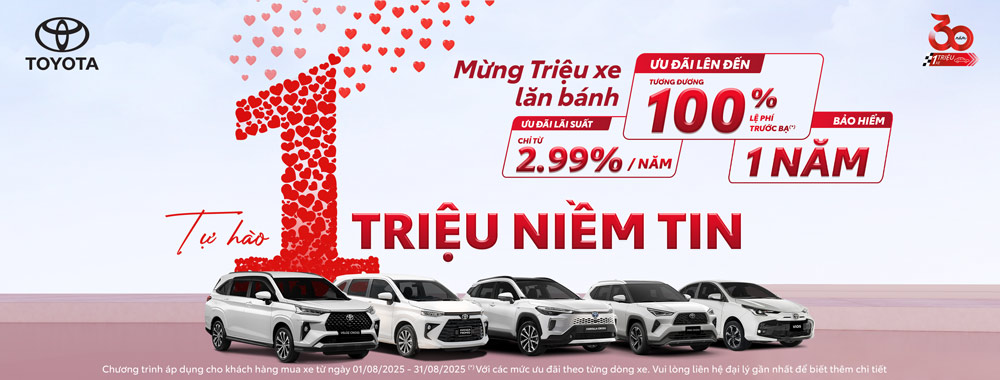 Tháng 8 này đánh dấu một cột mốc lịch sử đối với Công ty Ô tô Toyota Việt Nam (TMV) khi đạt một triệu xe lăn bánh trên dải đất hình chữ S. Để tri ân sự tin tưởng và đồng hành của khách hàng trong suốt thời gian qua, TMV cùng mạng lưới đại lý ủy quyền trên toàn quốc đã chính thức khởi động chuỗi chương trình khuyến mại và ưu đãi đặc biệt. Đây là cơ hội không thể bỏ lỡ để sở hữu những mẫu xe Toyota đẳng cấp, từ các phiên bản xăng truyền thống đến những lựa chọn hybrid tiên tiến cùng các gói hỗ trợ tài chính hấp dẫn.