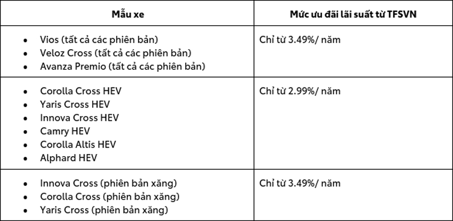 Các gói vay này được thiết kế để phù hợp với nhiều đối tượng khách hàng, từ những người ưu tiên sự ổn định trong thanh toán đến những người mong muốn có sự linh hoạt với khoản trả cuối kỳ. Quý khách hàng quan tâm đến các điều khoản và điều kiện cụ thể của chương trình ưu đãi lãi suất từ TFSVN trong tháng 8 năm 2025 nên liên hệ trực tiếp các Đại lý Toyota trên toàn quốc để nhận được sự tư vấn chi tiết và chính xác nhất. Mọi thông tin cập nhật sẽ luôn được thông báo đầy đủ và kịp thời từ TFSVN.